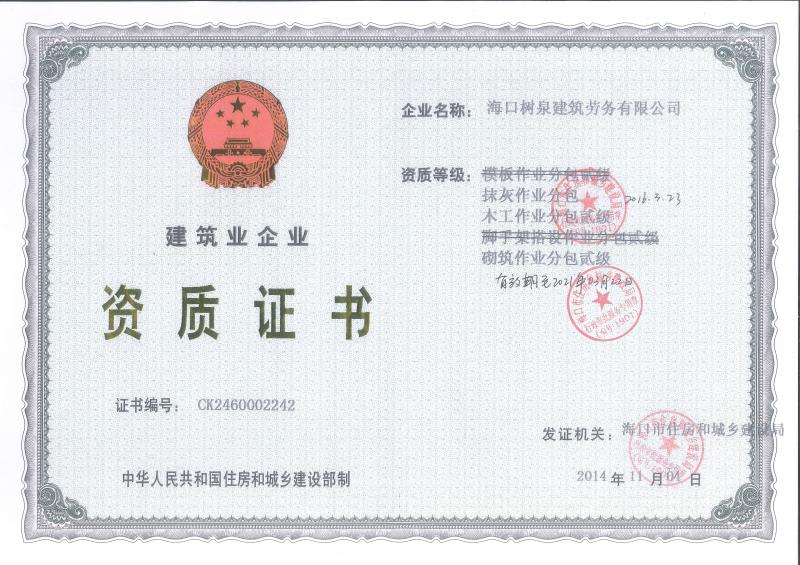海口樹泉建筑勞務有限公司成立于2011年,公司位于??冢淝吧硎且患覍I建筑施工隊,自2004年即開始在海南從事建筑勞務施工。自成立至今,公司已經擁有一支科學管理、質量過硬、能打硬仗,搶工期的專業隊伍。能獨立承擔大中型工業與民用建筑 、室內外裝修、各類機電設備安裝工程。代表工程有??跒I海華庭、三亞時代海岸T01/02/04/05棟高層、合肥東?;▓@二期、陵水富力灣B區高層、三亞金中海(酒店)、瓊海大印經典花園、海口環球海景大酒店(四星級酒店,在建中)、陵水珍珠大廈(五星酒店)、??谌f達廣場、美蘭機場二期。